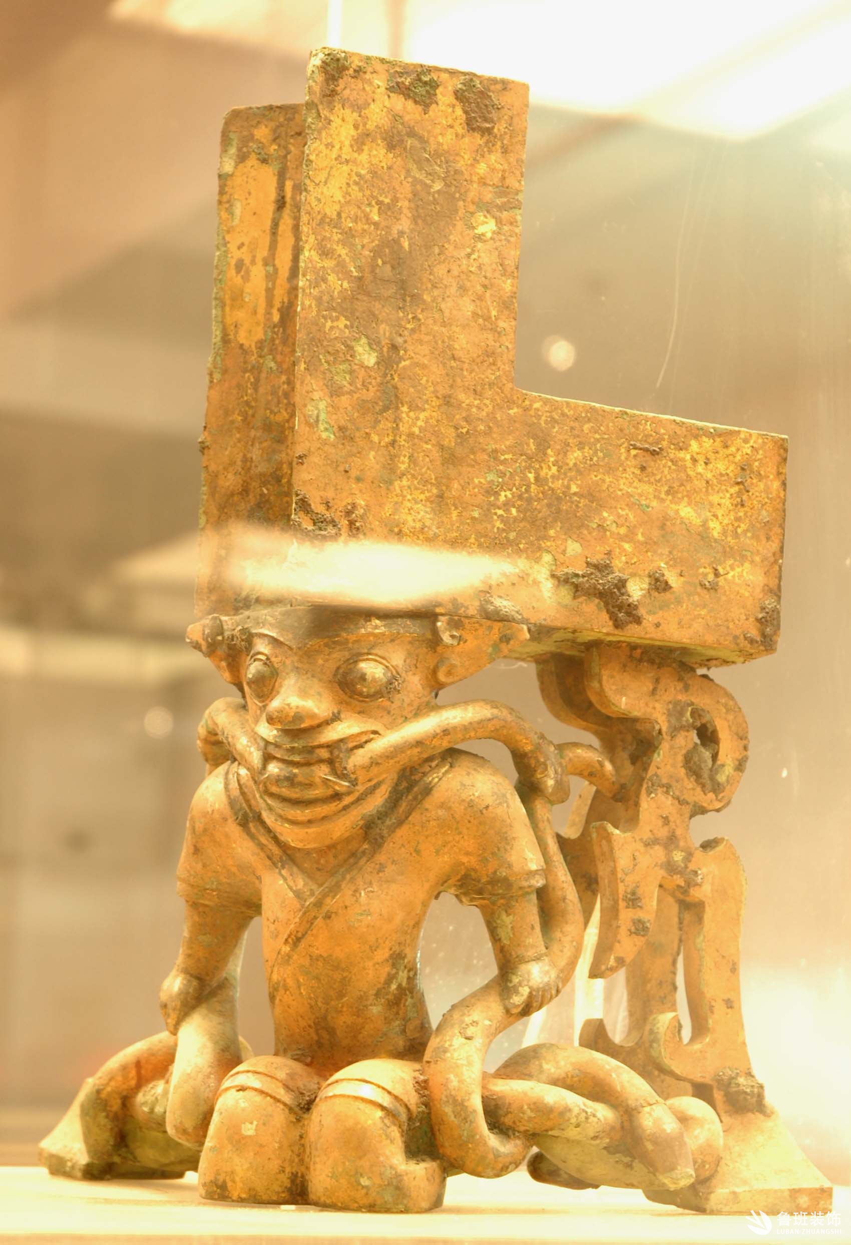 西漢。通高31.5、橫長15.8cm。結構分上下兩部分:上半部為兩個大小相同的扁長方套筒組成的活頁,可作90度展開,為屏風右翼障的下轉角構件。下半部為力士托座,取自“越人操蛇”的傳說。力士身著右衽褐衣,短褲,跣足。兩眼圓瞪,眼珠外突,口咬一兩頭蛇。雙手操蛇,雙足跪坐夾蛇,五條蛇相互絞纏,玲瓏通透。是兩千多年前越人抓蛇吃蛇形象的再現。原通體鎏金,并有黑漆繪線,現僅留斑點。現藏于:廣州西漢南越王博物館 。