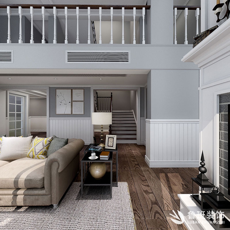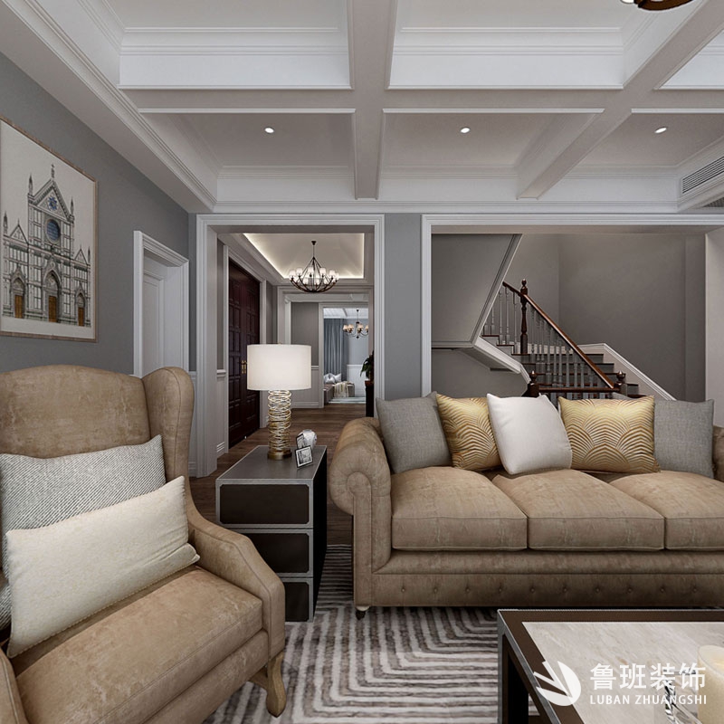 此案在分區保證了各個空間的相對的獨立性,客廳采用護墻板圍裙,墻面采用灰色給予冷暖搭配,頂面采用九宮格造型,選擇黃銅色燈及暖色燈光,摒棄了一些不必要的形體堆砌,盡量的呈現一種低調且具有一定文化內涵的新美式家居生活……