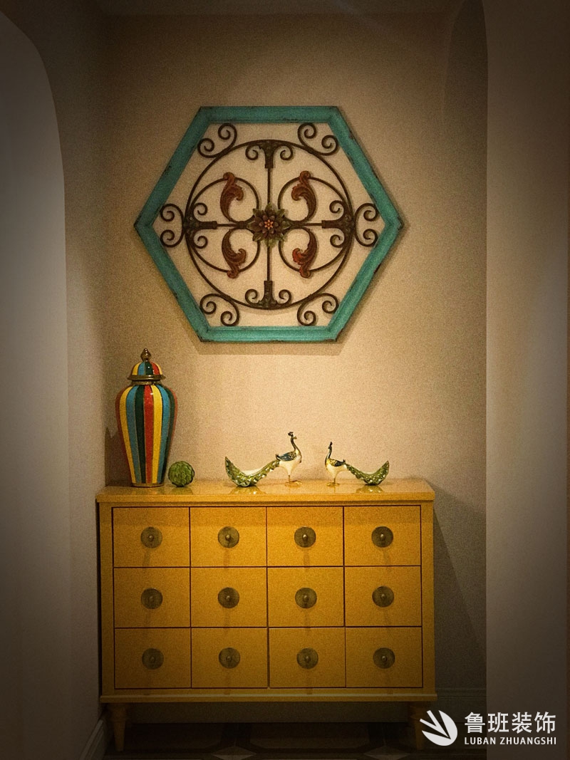 本作品是位于北濱路融景城的一套江景大平層,業主是一位喜歡旅游收集各類新鮮小玩意兒的美女。對于異域風情特別的偏好,顏色上主色調以啞光的黃色為主,搭配各類顏色鮮亮的地磚墻磚,現場制作的拱形造型,打造出一套足不出戶就享受異國風情的感覺,各類家具復古新派,精致的雕花家具,異域風情的小物件都是回憶的珍藏。